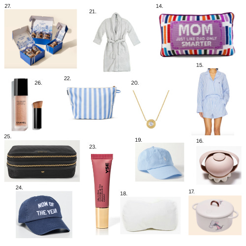 14. Mom Rules Needlepoint Pillow 15. Crop & Boxer PJ Set 16. Massager by Acera 17. Dutch Baby: Disney and Pixar's Ratatouille (kids would love this too) 18. The Boobie Pillow (want) 19. Polo Ralph Lauren Hat 20. Baby Bullseye Diamond 18k Necklace (My dad gave me a bezel necklace and I never take it off) 21. Signature Shawl Collar Adult Robe (so cozy) 22. Cabana Blue Striped Bag 23. Like a Gloss Hydrating Lip Tint (This just came out and I love it) 24. Mom of The Year Baseball Hat 25. Make-Up Cosmetics Case 26. Les Beiges Water-Fresh Tint 27. Mother's Day Cookie Tin Bundle