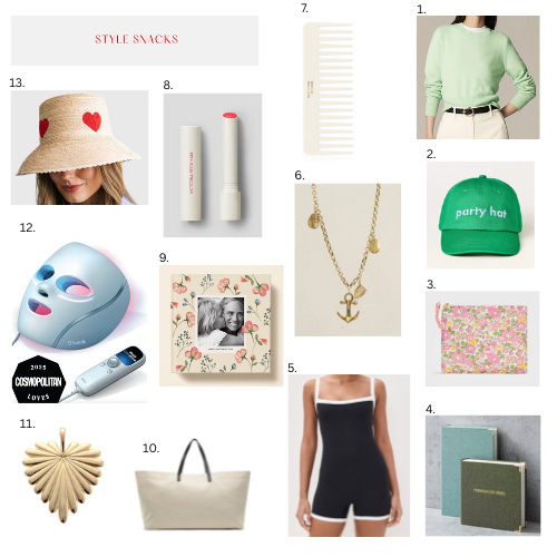 1. Cashmere Shrunken Crewneck Sweater 2. Party Baseball Hat 3. Soft Small Zip Pouch 4. Slip-In Fabric Photo Album 5. Monah Rigor Jumpsuit 6. Anchor Bronze Necklace 7. The Large Detangling Comb 8. Posh Balm (I want to try) 9. Petal Print Album 10. Beige Cottage Tote (cheaper alternative to The Row) 11. Love Full-Heart Pendant 12. Shark CryoGlow Face Mask (I want this) 13. Women's Heart Bucket Hat