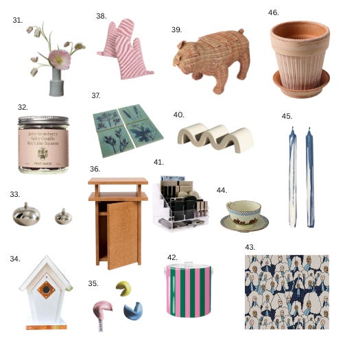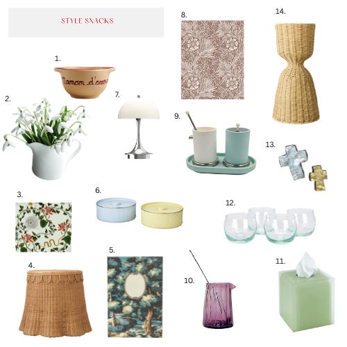 1. Sézane x Maison Roussot Bowl 2. Porcelain Flowers 3. Absolem Moss Wallpaper 4. Adeline Side Table 5. Antoinette Poisson French Domino Paper Notebook 6. Betthaj Tin with Lid 7. Panthella Acrylic Table Lamp 8. Marigold Umber Wallpaper 9. Alessi Ettore Sottsass Sugar Bowl & Creamer 10. Hand Blown Cocktail Mixing Glass 11. Iz Marina Green Bath Izod Tissue Cover 12. Set of 4 Stemless Wine Goblets 13. Barbara Biel Crosses 14. Rattan Reversible Outdoor Planter Basket