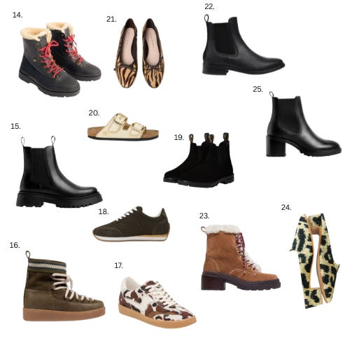 14. Florist Leather Wool-Lined Boot 15. Legend Platform 16. Cosmos Suede Boot 17. Notice Stitch Genuine Calf Hair Sneaker 18. Toteme Sport Sneakers 19. Blundstone Boot 20. Arizona Big Buckle Shearling Sandal 21. Noelle Ballet Flats 22. Duchess Boot 23. North Lace Up Lug Boot 24. Women's Clementine Velvet Mules 25. Knockout Boots
