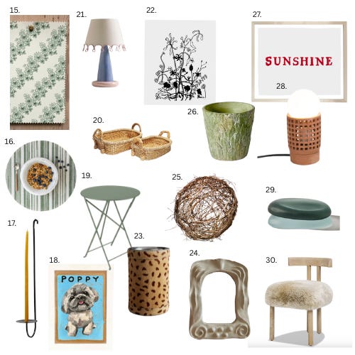 15. Folies Bergère Paper "Ermine" 16. Stuart Green Stripe Placemat 17. Single Armed Iron Candle Holder 18. Pet Portrait 19. Fermob Bistro Table 20. Braided Water Hyacinth Baskets 21. Desk Lamp 22. Springtime Print 23. Cheetah Print Wine Chiller 24. Handmade Ceramic Wall Mirror 25. Grapevine Ball 26. Feldburg Pot 27. Sunshine Print 28. Grid Light 29. The Resting Stone 30. Genuine Sheepskin Fur Split Back Dining Chair