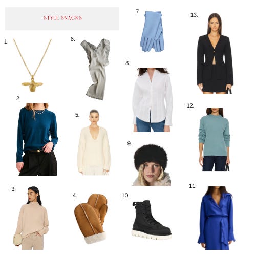 1. Teeny Tiny Necklaces 2. The Original Cashmere Sweater 3. Meritt Cashmere Turtleneck 4. Owen Barry Mittens 5. V Neck Sweater 6. Wool & Silk Top with Lace 7. Alpi Denim Gloves 8. Vanta Shirt 9. Honey Pie Headband 10. Chuck 70 Rugged Waterproof Boot 11. Silk Jacquard Shirt 12. Fabian Crew Sweater 13. Avalee Blazer